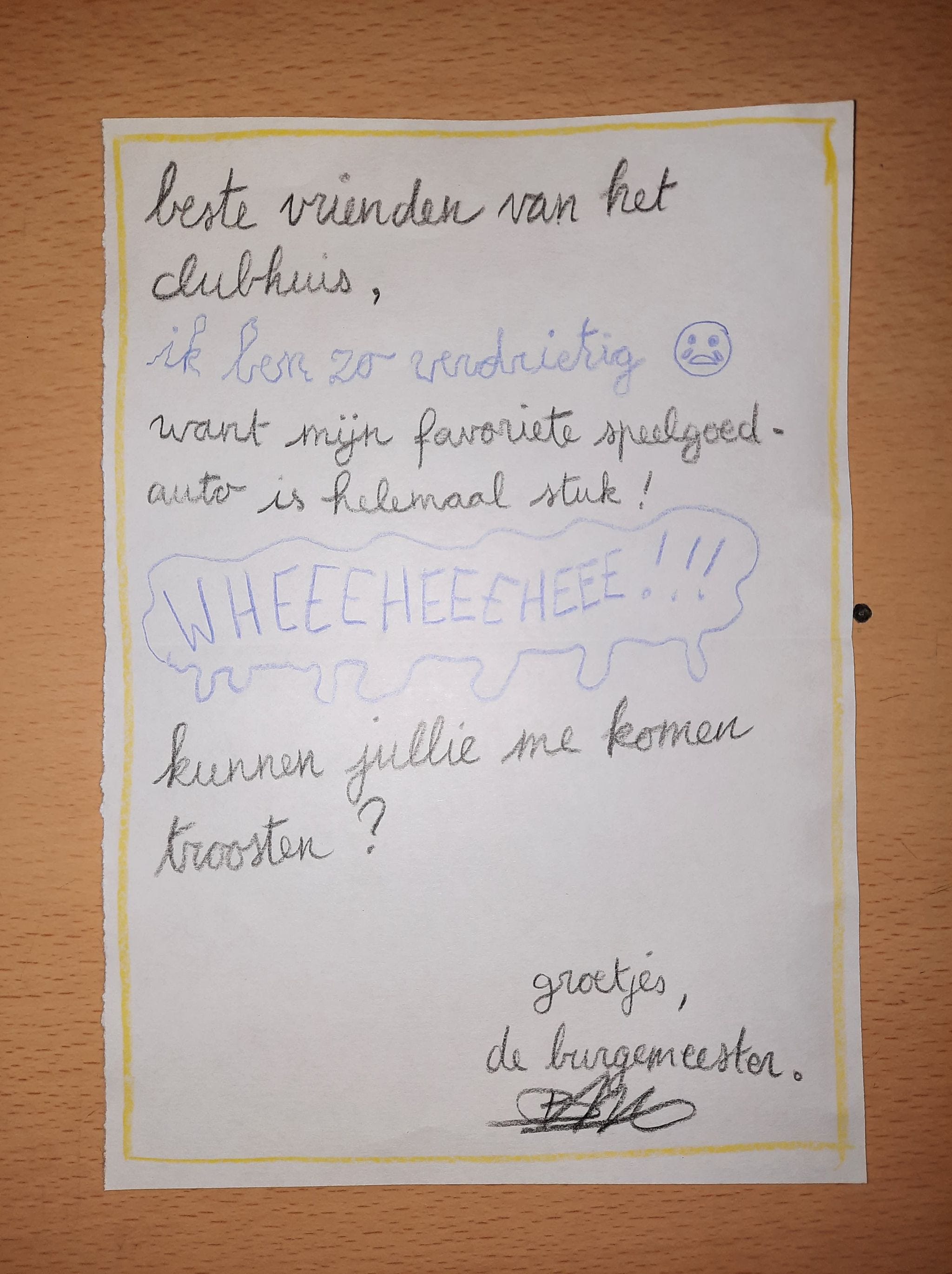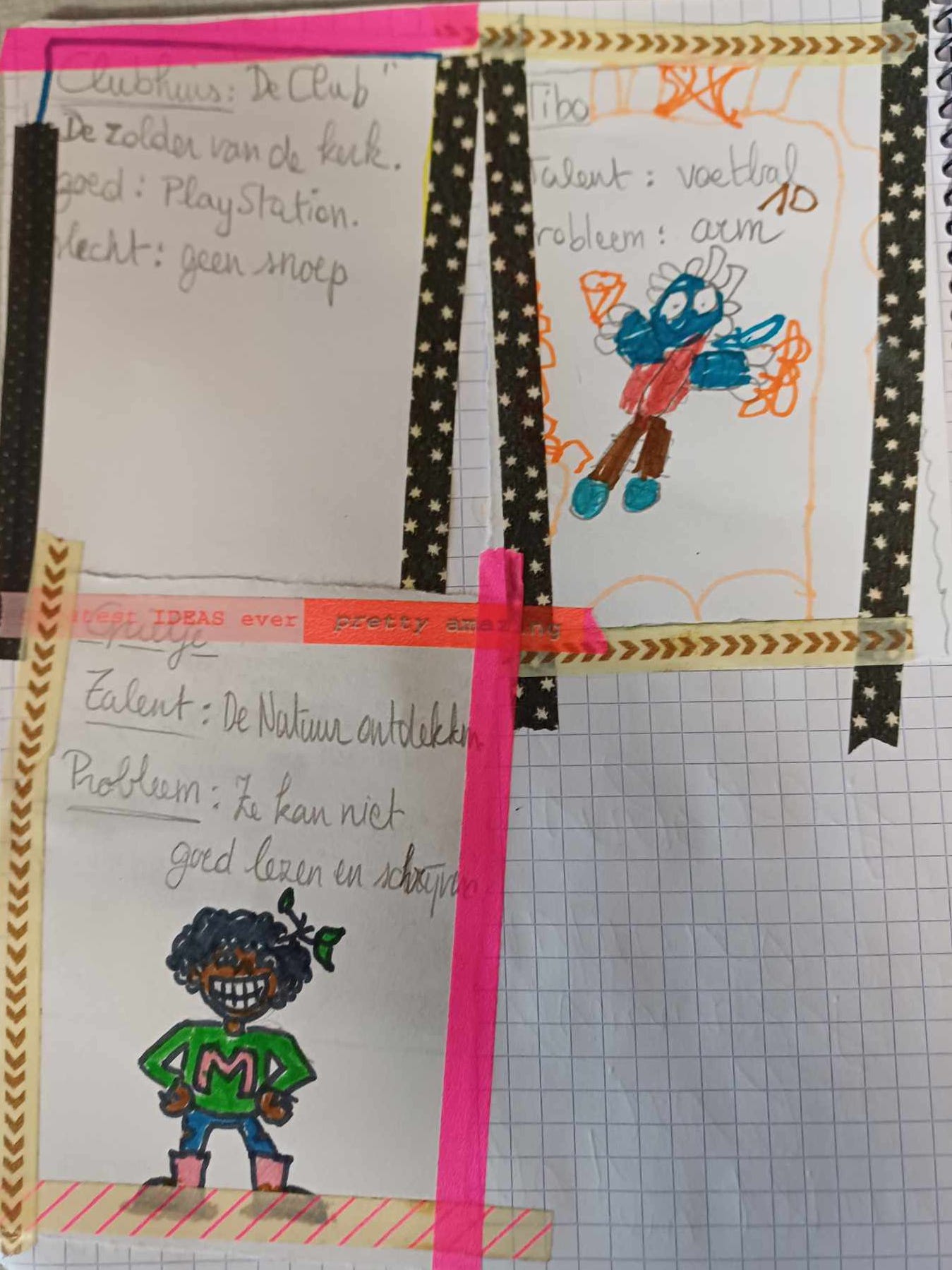 The Clubhouse is an interesting location: A treehouse, The Attic, An Underground Bunker, The Moon … The clubhouse has a name and a description. Optionally there could be a problem with it, but it should remain a safe space. We draw this only if we have enough time.